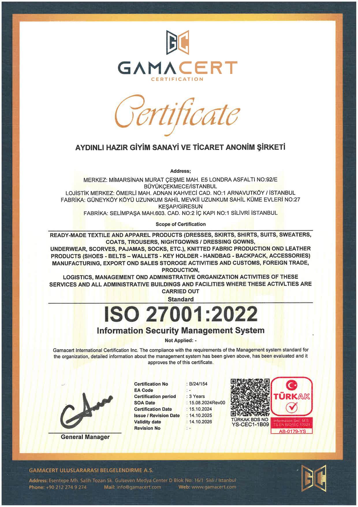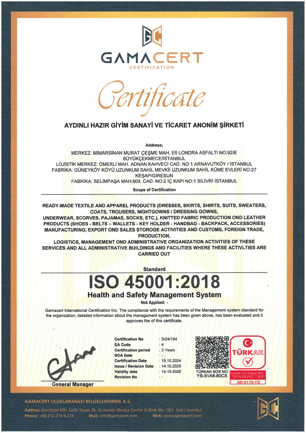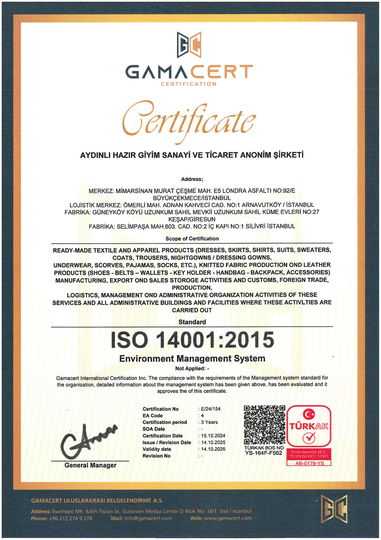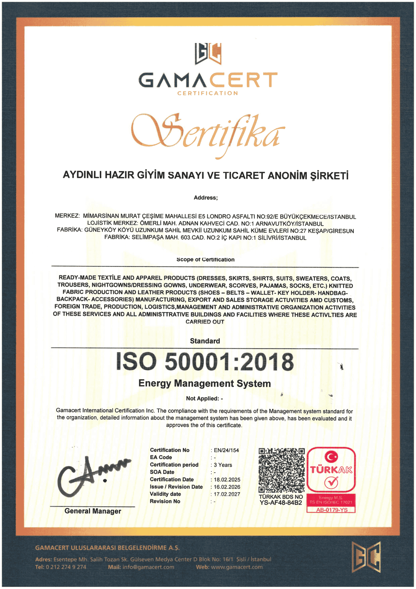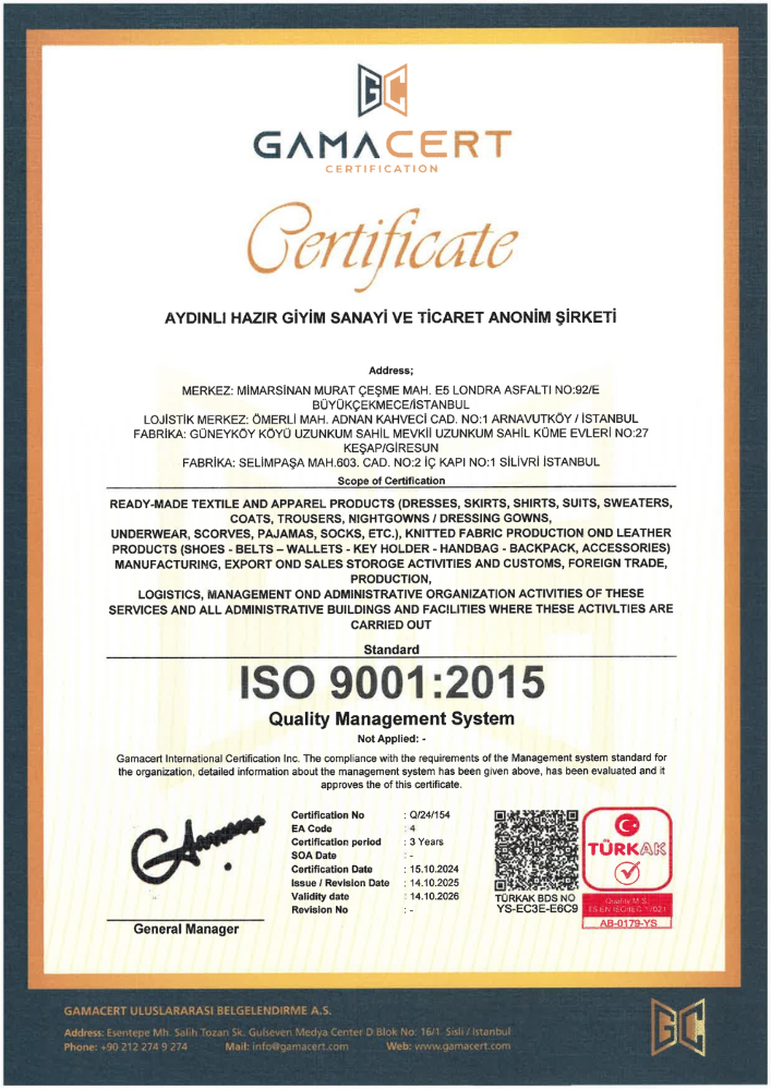 At Aydınlı Group, we hold internationally recognized management system certifications in the fields of quality, environment, occupational health and safety, information security, and energy management. These certifications are issued by independent organizations accredited by TÜRKAK (Turkish Accreditation Agency) and verify our compliance with ISO standards.